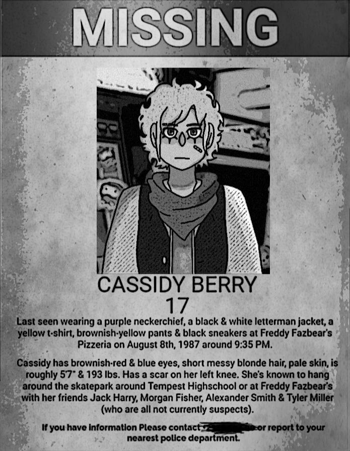 Cassidy was described as a rebel, from a home where her parents neglected her during her teen years due to being tomboyish & of course getting into mischief with her friends. A punk, a "skater girl" if you will, but one thing was always known; she had been a fan of Freddy's since she was a kid, even after the death of her cousin, Charlotte, she continued to go out of spite for her parents who had resented the company (& Henry as a whole, believing that he was somewhat responsible for his daughter's death) & tried to keep Cassidy away from the pizzeria chains. Of course, that never stopped her. Maybe it should have, in hindsight.She wasn't a bad kid, not at all, she only wanted to pursue her career in sports & even programming, but her parents thought it was too "masculine" & had other plans for her career. It's a shame, she was pretty close to graduating as well.